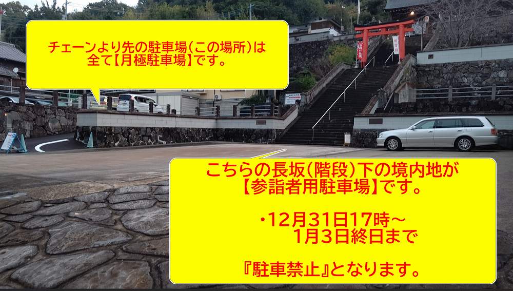 以前、正月三が日の期間に当神社の駐車場の満車状態が引き金となって近隣道路の渋滞を引き起こす事例が多発しました。