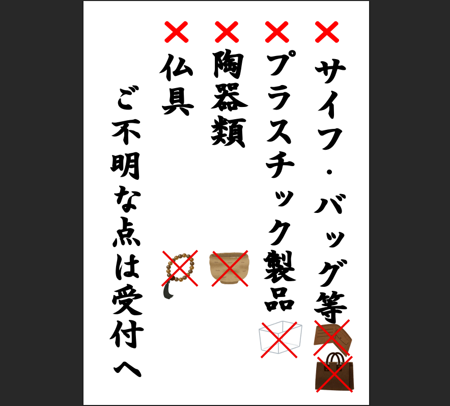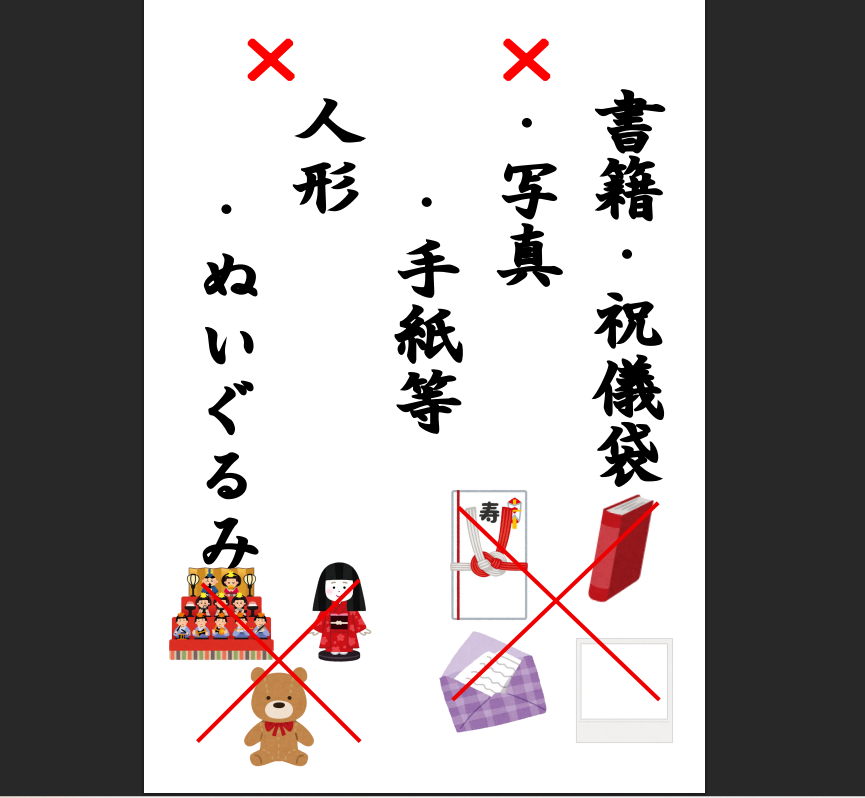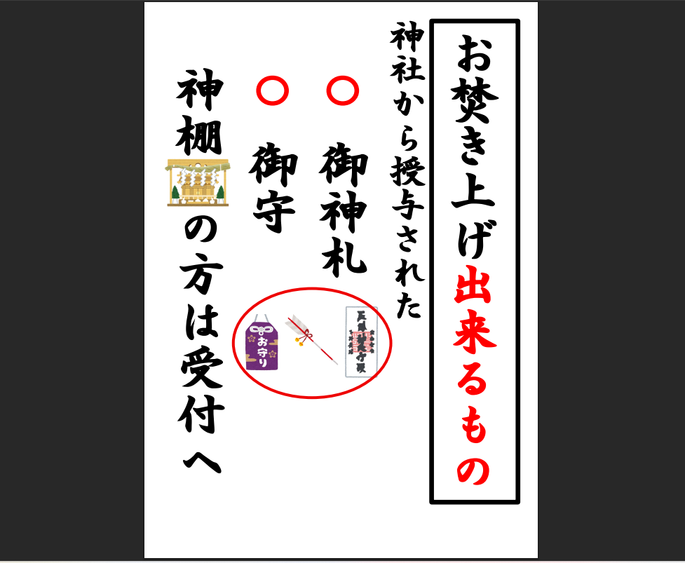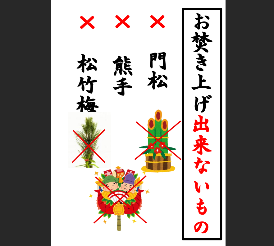 なお、鬼火焚きについては「お焚き上げ出来るもの」「お焚き上げ出来ないもの」がありますのでご注意ください。